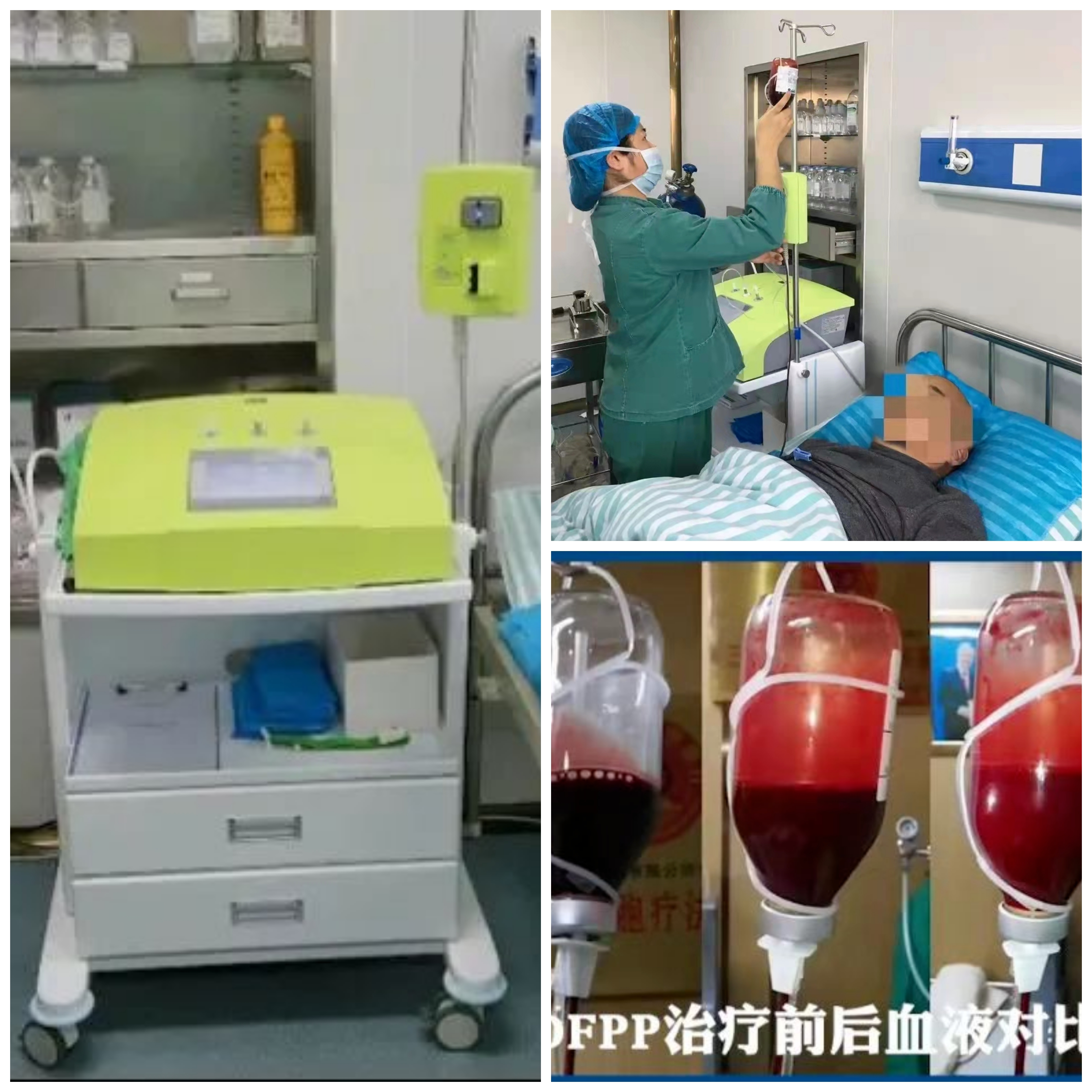 同时输入特定浓度氧化剂,几微秒内就会和血液内的物质发生化学反应,产生各种免疫细胞和抗病毒因子,然后将净化的血浆回输患者体内,达到治疗目的。