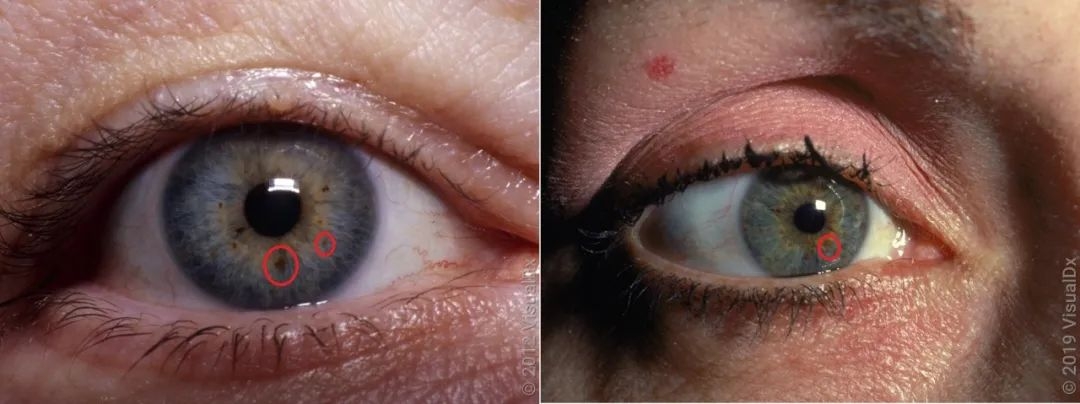 即虹膜处凸起的棕褐色错构瘤,不会以任何方式影响视力,多在成人中出现,如下图所示: