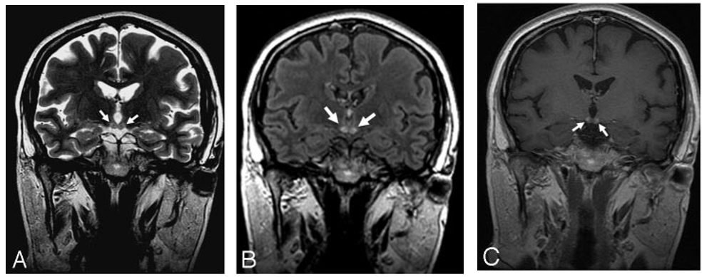 这是由于维生素B1缺乏引起的中枢神经系统代谢性脑病,酗酒是最常见的诱发因素。临床以精神症状、眼肌麻痹和共济失调三主征为主要表现,MRI异常信号围绕第三/第四脑室和导水管。最常受累的结构为乳头体,见于80%的韦尼克脑病患者。如果丘脑背内侧受累,常伴有记忆力障碍。