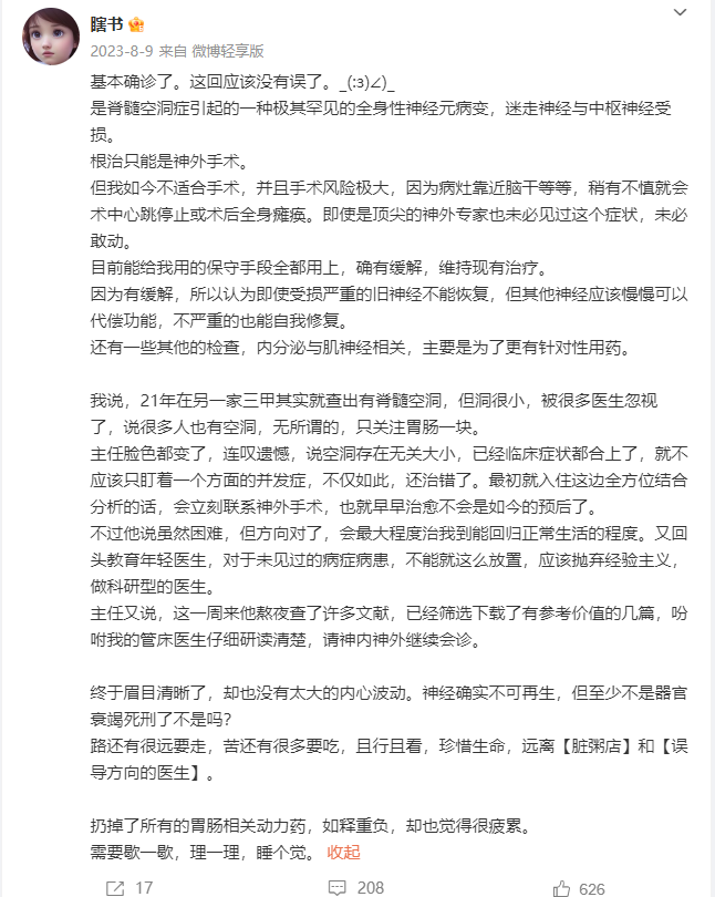 2021年4月便开始进入治疗的她,直到2023年8月才最终确诊为脊髓空洞症引发的极其罕见的全身性神经元病变,迷走神经与中枢神经受损,而瞎书的身体状况已不适合手术,风险过大,只能选择保守治疗。