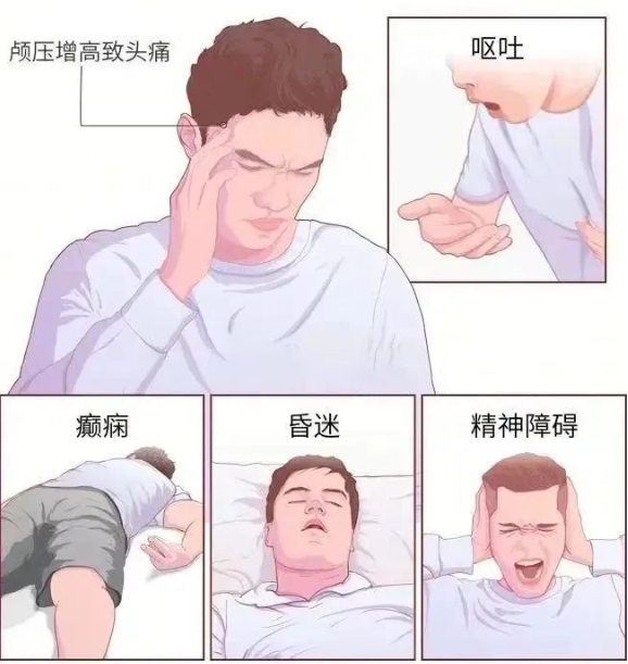 一部分人有短暂的“清醒期”,随后开始出现呕吐、头痛、肢体偏瘫、抽搐、肌力障碍、癫痫等症状。