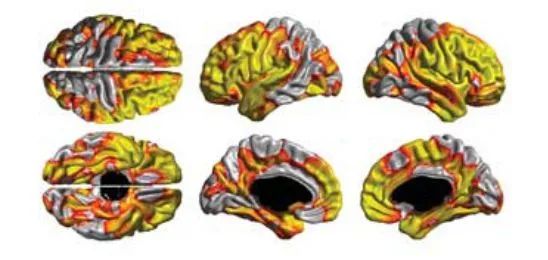 这是在英国一项对老年吸烟者的研究中发现的,图片里面灰色部分是吸烟者相对不吸烟者萎缩掉的大脑皮层。如果继续抽烟抽下去,我们的大脑可能就会萎缩到只剩黄色那部分。