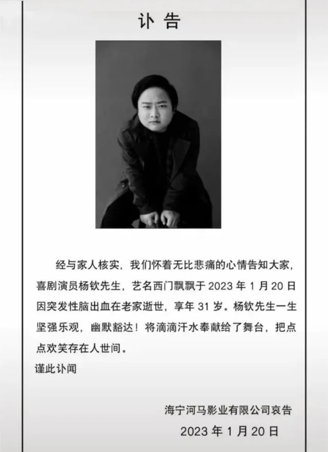 前段时间,某影业公司发布讣告,喜剧演员杨钦(网名:西门飘飘),突发脑出血于1月20日在老家去世,年仅31岁。