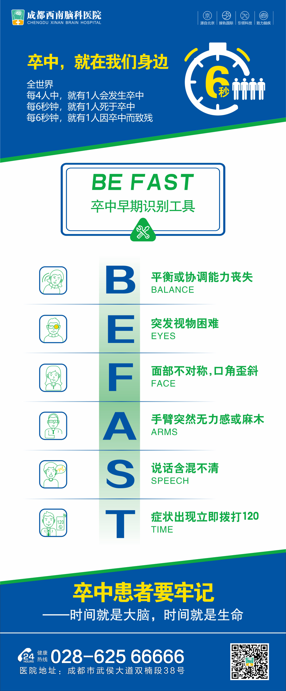 而较近的一项调查显示,近30%的45岁以下人群不知道中风的迹象。但早期发现是降低并发症风险的关键。研究估计,每分钟中风可摧毁约200万个大脑神经元。