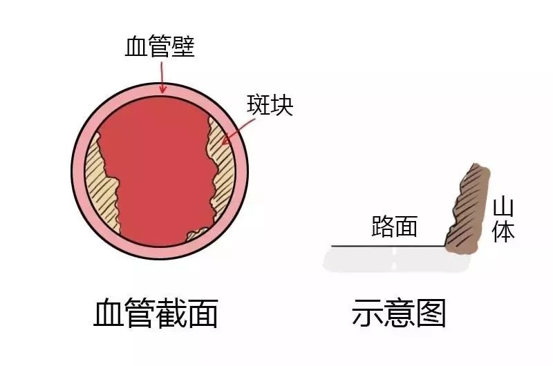 我们以盘山路代表血管,正常情况下车辆(血细胞)可以穿行。临靠的山体我们把它比作附着有斑块的血管壁。