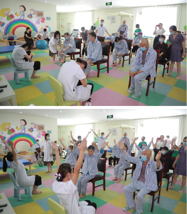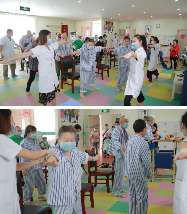 我院医护人员正在带领帕金森患者做康复操。