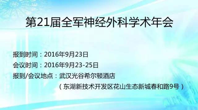 由中国人民解放军神经外科学专业委员会主办、武汉总医院神经外科承办的第21届全军神经外科学学术年会于2016年9月23日至9月25日在湖北武汉召开。本次年会的主题为“军事脑科学与神经外科新技术”。