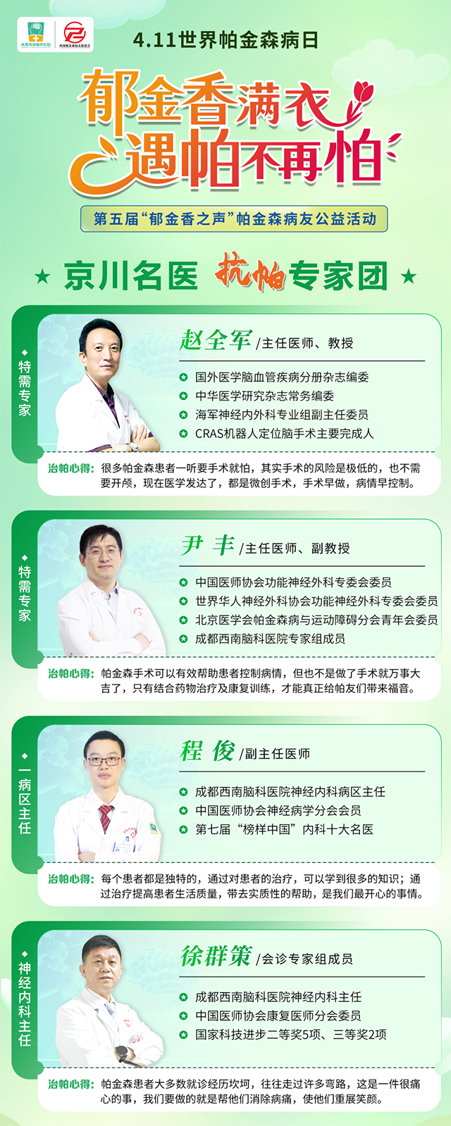 4月以来,成都反复出现疫情,受其影响,很多想来参加活动的帕金森病友来不了了。经我院研究决定,原定于4月9~13日开展的第五届“郁金香之声”帕金森病友公益活动,延期至5月1~5日。请大家合理安排好自己的时间,来院途中注意做好个人防护,提前打开健康码,积极配合测量,安全就诊。