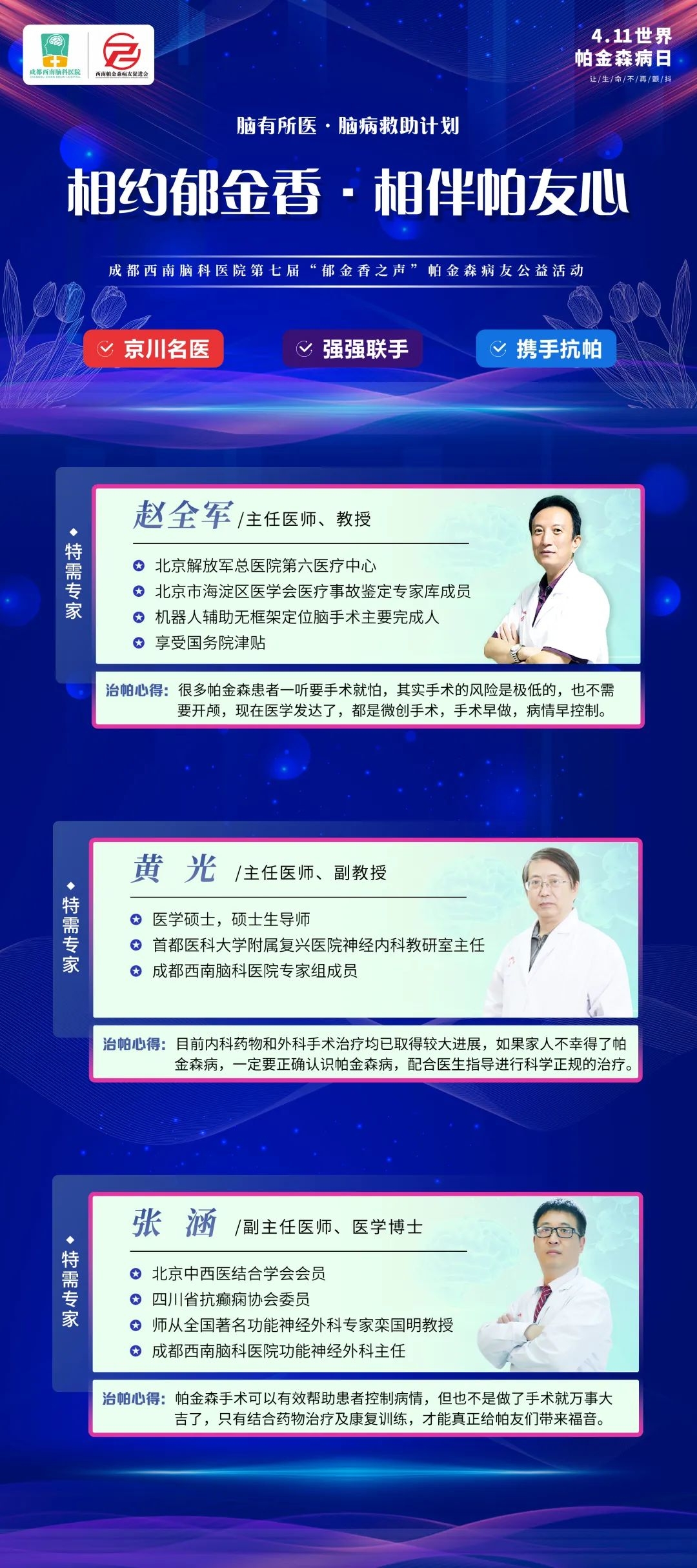 今年的4·11格外不一样,西南脑科医院联合四川省医学传播学会,为广大的西南地区帕金森病友奉献期盼已久的公益大餐——“郁金香之声”帕金森病友公益行活动!