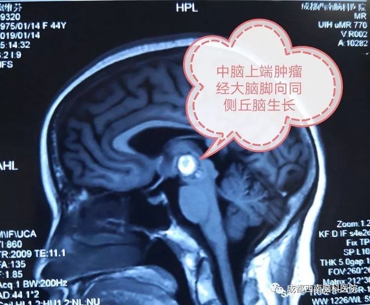 这样的情况下,她以“视物模糊伴重影18天,加重伴左眼睑下垂3天”入成都西南脑科医院。入院查体见左侧动眼神经麻痹,余未见异常。MRI检查显示,扈女士颅内的肿瘤位于中脑上端,经大脑向同侧丘脑发展,血管成像肿瘤显影良好,初步诊断为脑干肿瘤,海绵状血管瘤可能性大。